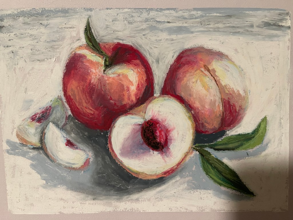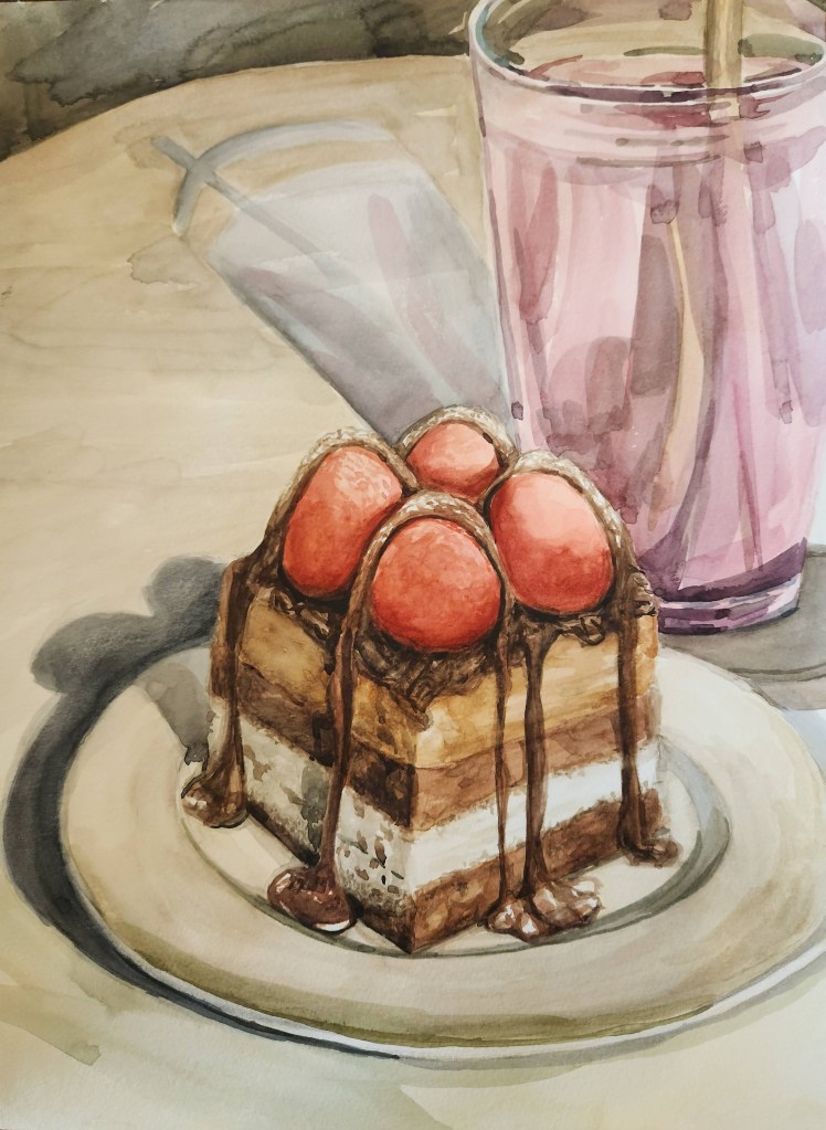 Watercolor painting of a chocolate cake and a glass of juice. It was interesting painting with watercolors where I had to layer the paint carefully so that it didn’t bleed through the paper. It was a challenging process but very rewarding.